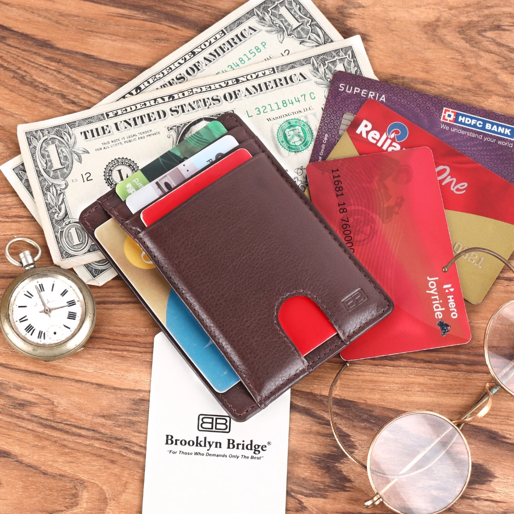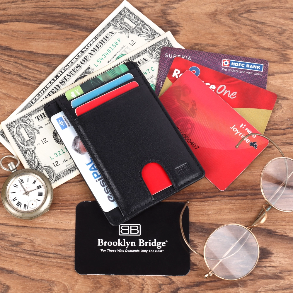 Exalter Global Co. crafts this genuine leather card holder using soft Nappa leather. It offers a smooth finish and long lasting durability. The Brooklyn Bridge collection adds a modern touch while maintaining high quality standards. Ideal for men seeking a premium slim wallet.